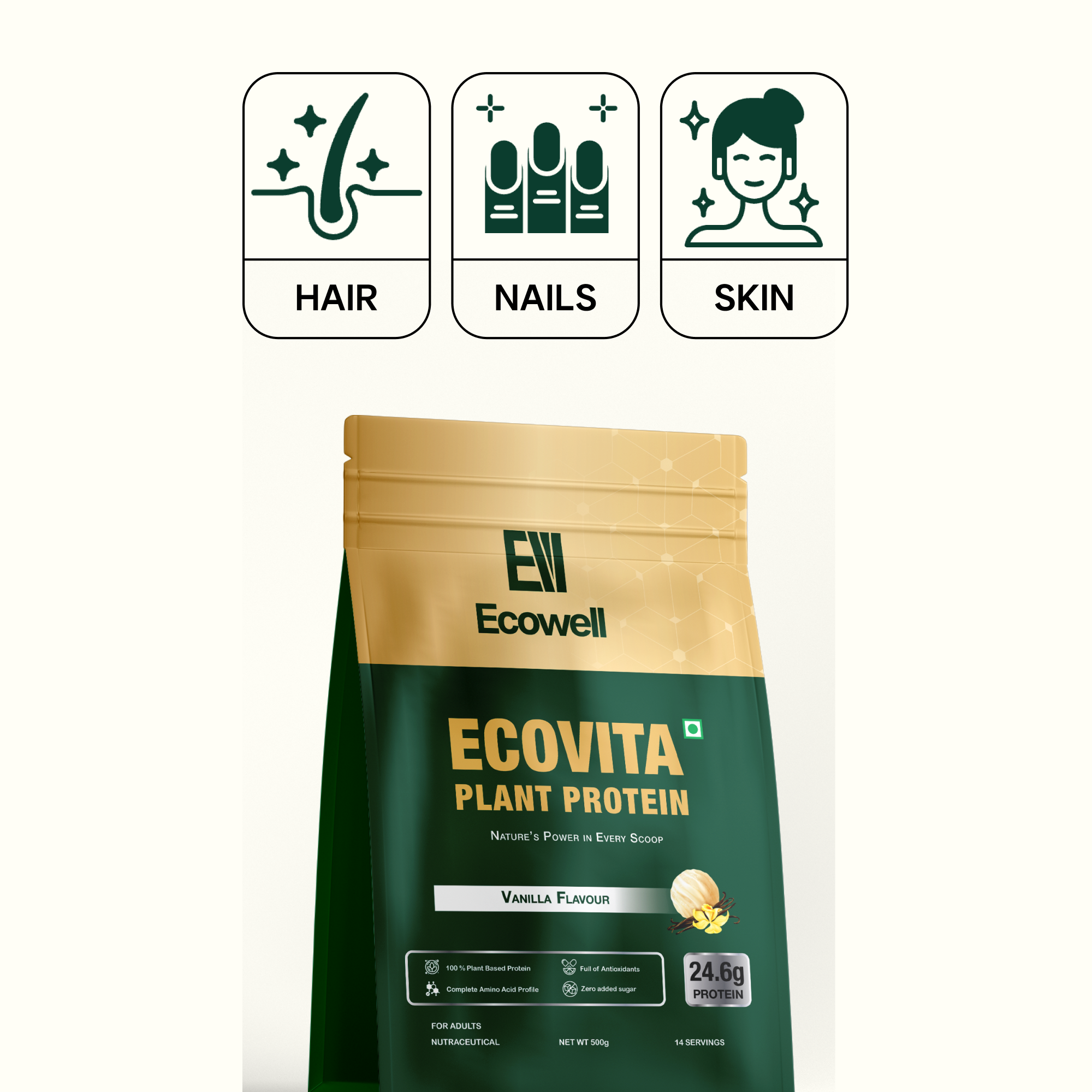 Ecovita Plant Protein Powder, specially formulated for Indian Men & women facing protein deficiency. Our premium blend combines high-quality Pea Protein Isolate, Brown Rice Protein, and nutrient-rich Flaxseed to deliver 24.6g of complete protein per serving.